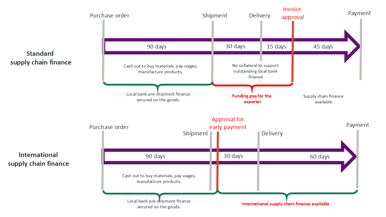 On the other hand, because there is only one bank involved, the shipping documents are ignored, and because everything is driven by the buyer's invoice approval, supply chain finance programs are easy to scale and simple to operate. Each day the buyer transmits a file of approved invoices to the bank - and the bank simply pays them immediately to the suppliers providing the buyer with time to pay.
